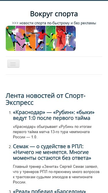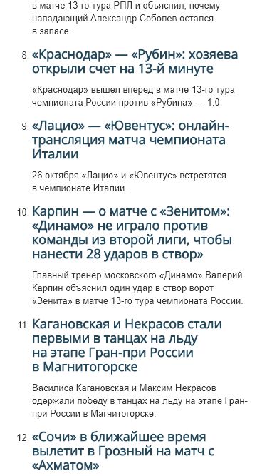 Анкоры текстовых ссылок: Вокруг спорта >>> новости спорта по-быстрому и без рекламы; Включить/выключить навигацию; Лента новостей; Все новости от Sports.ru; Все новости от Спорт-Экспресс; Все новости от Чемпионат.com; Главные новости; Главное на Sports.ru; Главное на Sportbox.ru; Футбол; Новости футбола от Sports.ru; Новости футбола от Sportbox.ru; Новости футбола от Спорт-Экспресс; Новости футбола от Чемпионат.com; Хоккей; Новости хоккея от Sportbox.ru; Новости хоккея от Спорт-Экспресс; Новости хоккея от Чемпионат.com; Баскетбол; Новости баскетбола от Sportbox.ru; Новости баскетбола от Спорт-Экспресс; Новости баскетбола от Чемпионат.com; Теннис; Новости тенниса от Спорт-Экспресс; Новости тенниса от Чемпионат.com; Фигурное катание; Плавание; Лента новостей от Спорт-Экспресс; «Краснодар» — «Рубин»: «быки» ведут 1:0 после первого тайма; Семак — о судействе в РПЛ: «Ничего не меняется. Многие моменты остаются без ответа»; «Реал» победил «Барселону» в класико; Агент Кузнецова заявил, что интерес клубов НХЛ к нападающему сохраняется; Карпин заявил, что не думает о матче с «Зенитом» в Кубке России; Карпин заявил, что вратарь Расулов провел неплохую игру против «Зенита»; Семак: «Соболев на сегодняшний день — не второй и не третий кандидат на позицию нападающего»; «Краснодар» — «Рубин»: хозяева открыли счет на 13-й минуте; «Лацио» — «Ювентус»: онлайн-трансляция матча чемпионата Италии; Карпин — о матче с «Зенитом»: «Динамо» не играло против команды из второй лиги, чтобы нанести 28 ударов в створ»; Кагановская и Некрасов стали первыми в танцах на льду на этапе Гран-при России в Магнитогорске; «Сочи» в ближайшее время вылетит в Грозный на матч с «Ахматом»; Форвард «Автомобилиста» Голышев забросил первую шайбу после дисквалификации; Агент Кузнецова о дебюте нападающего в «Металлурге»: «Пока всем доволен»; «Спартак» нанес «Сочи» восьмое поражение подряд; РПЛ, расписание и результаты 13-го тура: «Акрон» и «Локомотив» сыграли вничью, «Зенит» победил «Динамо» и другие матчи; «Реал» — «Барселона»: Мбаппе не реализовал пенальти; «Зенит» победил московское «Динамо» в домашнем матче; «Байер» всухую обыграл «Фрайбург» и одержал четвертую подряд победу в Бундеслиге; «Зенит» — «Динамо»: судья отменил гол питерцев и красную карточку Расулова; Наверх
