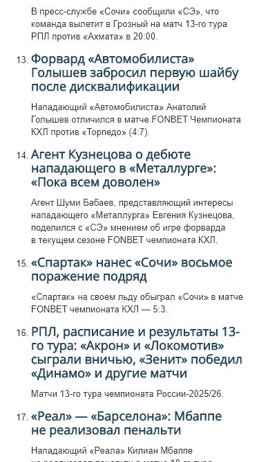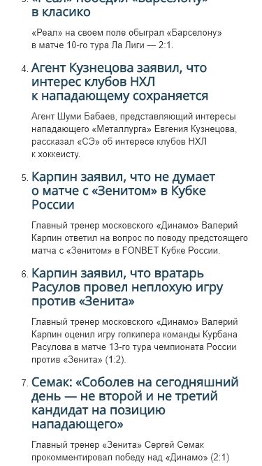 Наличие H3 тегов: «Краснодар» — «Рубин»: «быки» ведут 1:0 после первого тайма; Семак — о судействе в РПЛ: «Ничего не меняется. Многие моменты остаются без ответа»; «Реал» победил «Барселону» в класико; Агент Кузнецова заявил, что интерес клубов НХЛ к нападающему сохраняется; Карпин заявил, что не думает о матче с «Зенитом» в Кубке России; Карпин заявил, что вратарь Расулов провел неплохую игру против «Зенита»; Семак: «Соболев на сегодняшний день — не второй и не третий кандидат на позицию нападающего»; «Краснодар» — «Рубин»: хозяева открыли счет на 13-й минуте; «Лацио» — «Ювентус»: онлайн-трансляция матча чемпионата Италии; Карпин — о матче с «Зенитом»: «Динамо» не играло против команды из второй лиги, чтобы нанести 28 ударов в створ»; Кагановская и Некрасов стали первыми в танцах на льду на этапе Гран-при России в Магнитогорске; «Сочи» в ближайшее время вылетит в Грозный на матч с «Ахматом»; Форвард «Автомобилиста» Голышев забросил первую шайбу после дисквалификации; Агент Кузнецова о дебюте нападающего в «Металлурге»: «Пока всем доволен»; «Спартак» нанес «Сочи» восьмое поражение подряд; РПЛ, расписание и результаты 13-го тура: «Акрон» и «Локомотив» сыграли вничью, «Зенит» победил «Динамо» и другие матчи; «Реал» — «Барселона»: Мбаппе не реализовал пенальти; «Зенит» победил московское «Динамо» в домашнем матче; «Байер» всухую обыграл «Фрайбург» и одержал четвертую подряд победу в Бундеслиге; «Зенит» — «Динамо»: судья отменил гол питерцев и красную карточку Расулова; Голосование